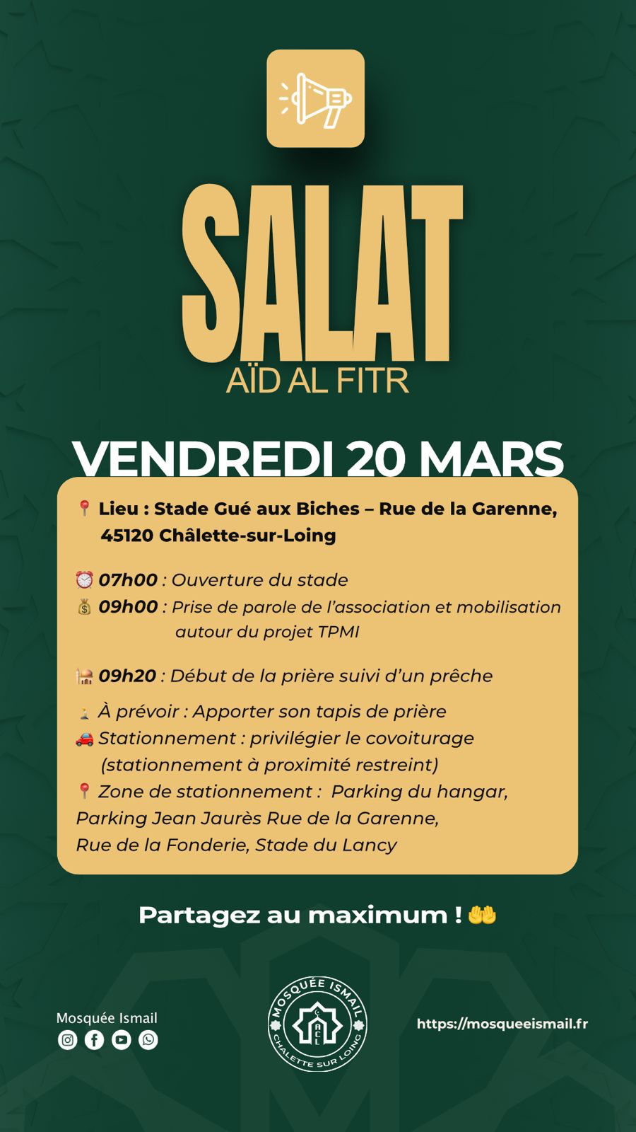 🕌 Horaires de la prière de l'Aïd — Vendredi 20 mars 2026
