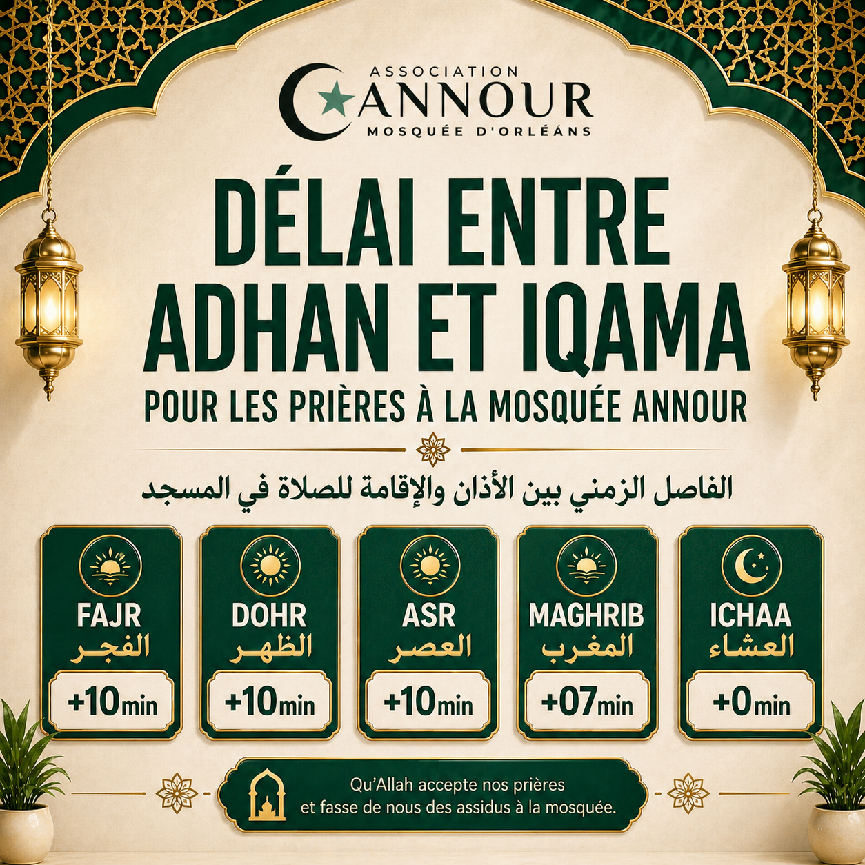 ⏰️ Délai entre Adhan et Iqama – Mosquée Annour