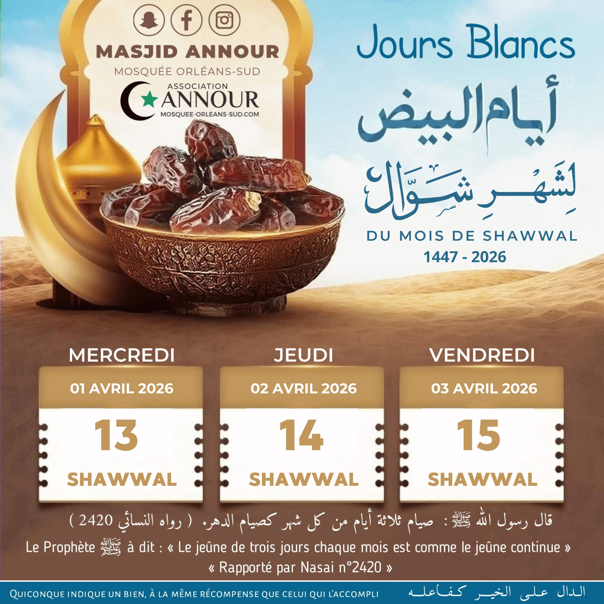 Jours blancs - Shawwal 1447 26/03/2026 Les jours blanc pour Shawwal 1447 : https://assalate.latrach.net/hijri-miladi-calendar-11-1447-dhu-al-qidah jours blancs shawwal