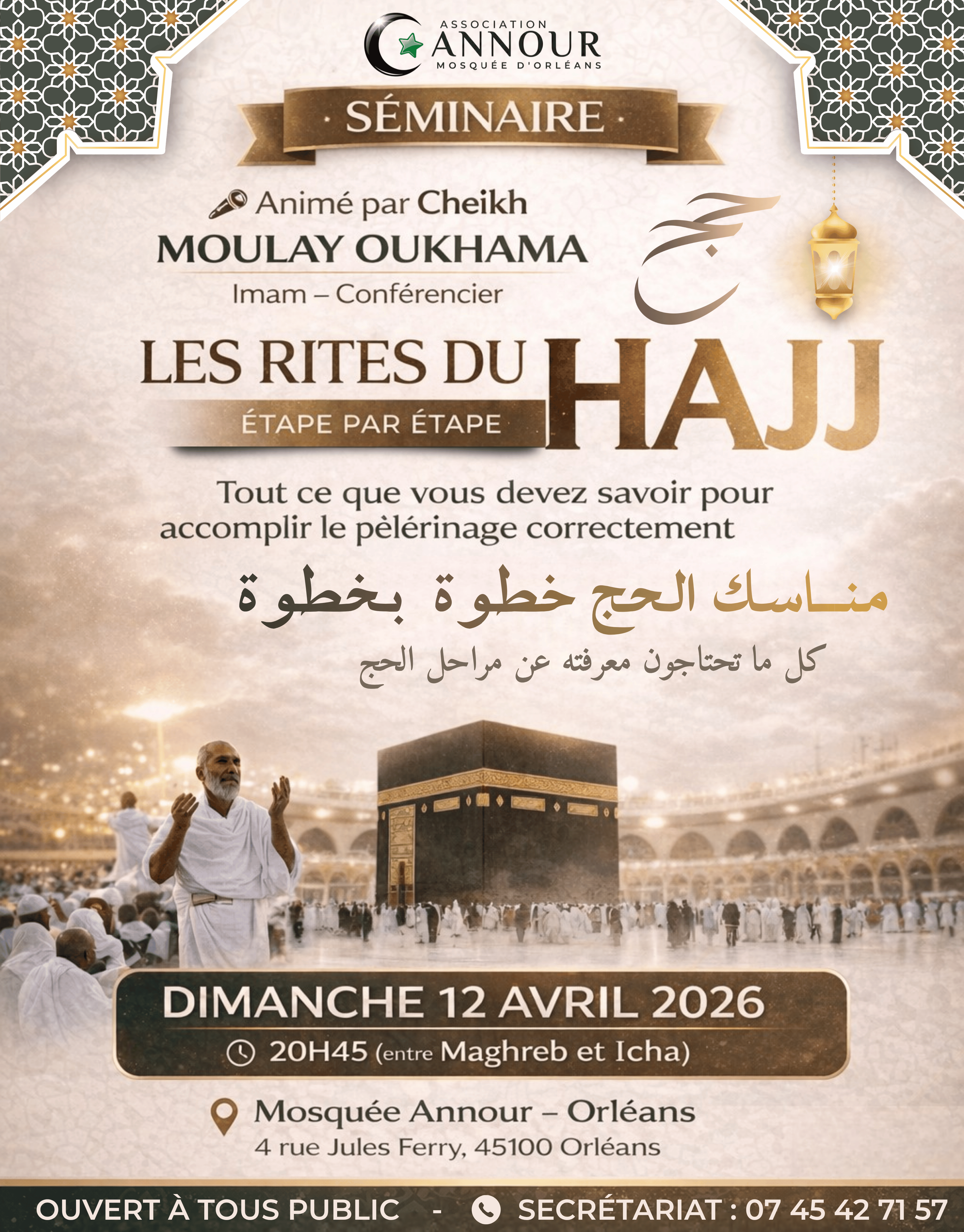 Ce séminaire est bien plus qu’une simple présentation : c’est une invitation à la réflexion, à la purification du cœur et à l’élévation de l’âme. Que vous envisagiez d’accomplir le Hajj ou que vous souhaitiez simplement en approfondir la compréhension, cet événement vous apportera une lumière nouvelle et une motivation sincère.