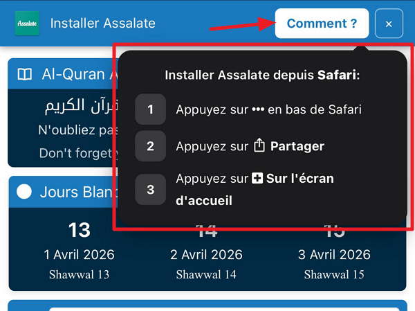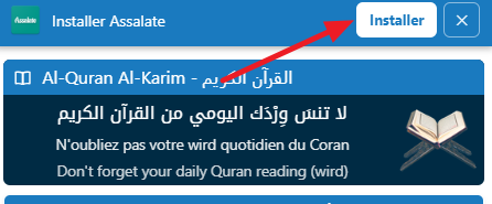 Pour recevoir les notifications sur mobile, il faut d'abord installer Assalate comme application (PWA) depuis votre navigateur. Sans cette installation, les notifications peuvent etre limitees ou ne pas fonctionner selon l'appareil.
